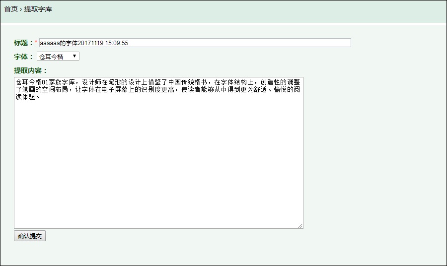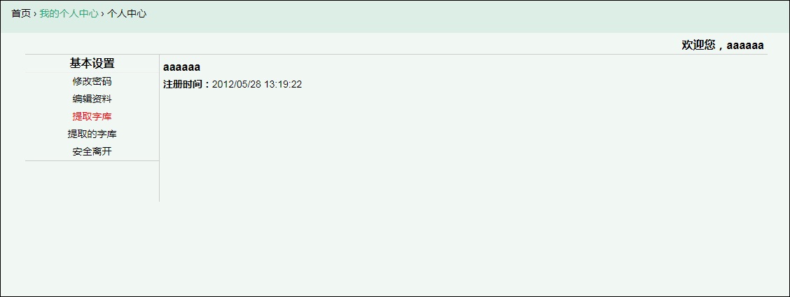 先登录我们的网站(登录)在用户中心左侧有个红色提取字库的链接,点击